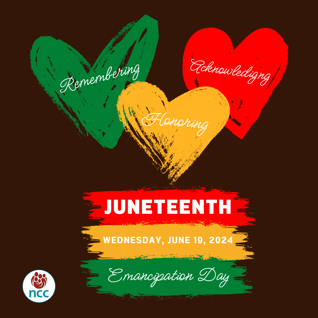 Dear Friend, Today, June 19, 2024, NCC takes an introspective look at past triumphs, profoundly commemorating a moment that embedded an imperative turning point in our history. NCC upholds creating inclusion, compassion, and empowerment within the community for individuals with varying abilities to live, grow, work, and thrive. This would not be possible without the catalyst in which our country experienced on Emancipation Day. Today is not an intangible symbol to remember one day out of the year. Today, in 1865, we rewrote our lives' stories, restructured our society's fabric, and advocated human rights for an inclusive future. | |